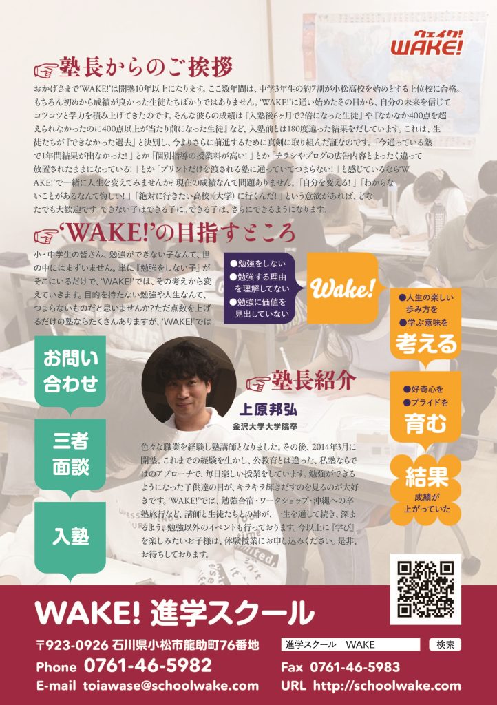 お知らせ 2024年8月1日 WAKEについて « 前の記事 次の記事 » WAKE 高等部 WAKE Plus 高等部 〒923-0926 石川県小松市龍助町 76 WAKE 小・中等部 WAKE Plus 小・中等部 〒923-0948 石川県小松市錦町41 お問い合わせ